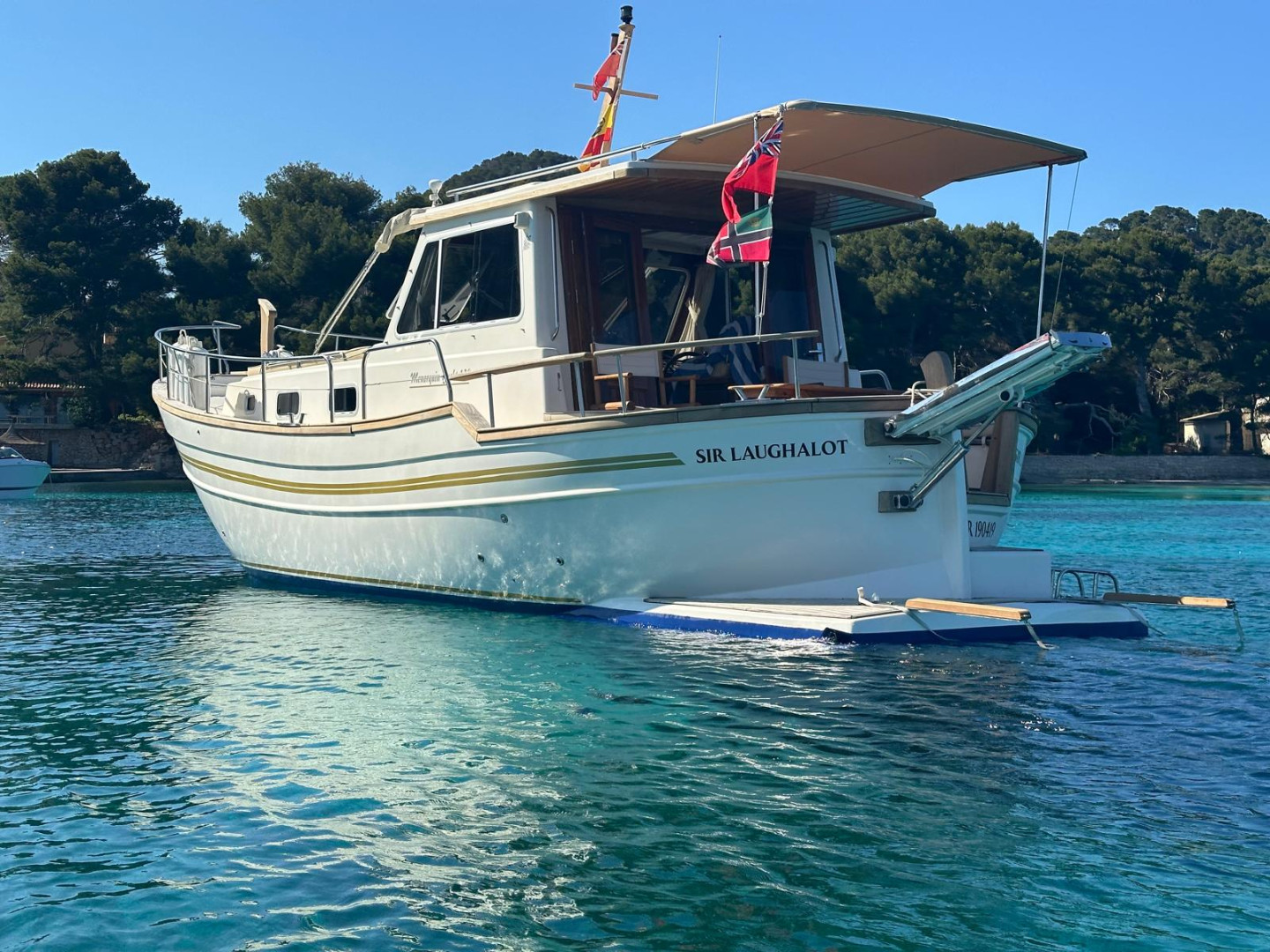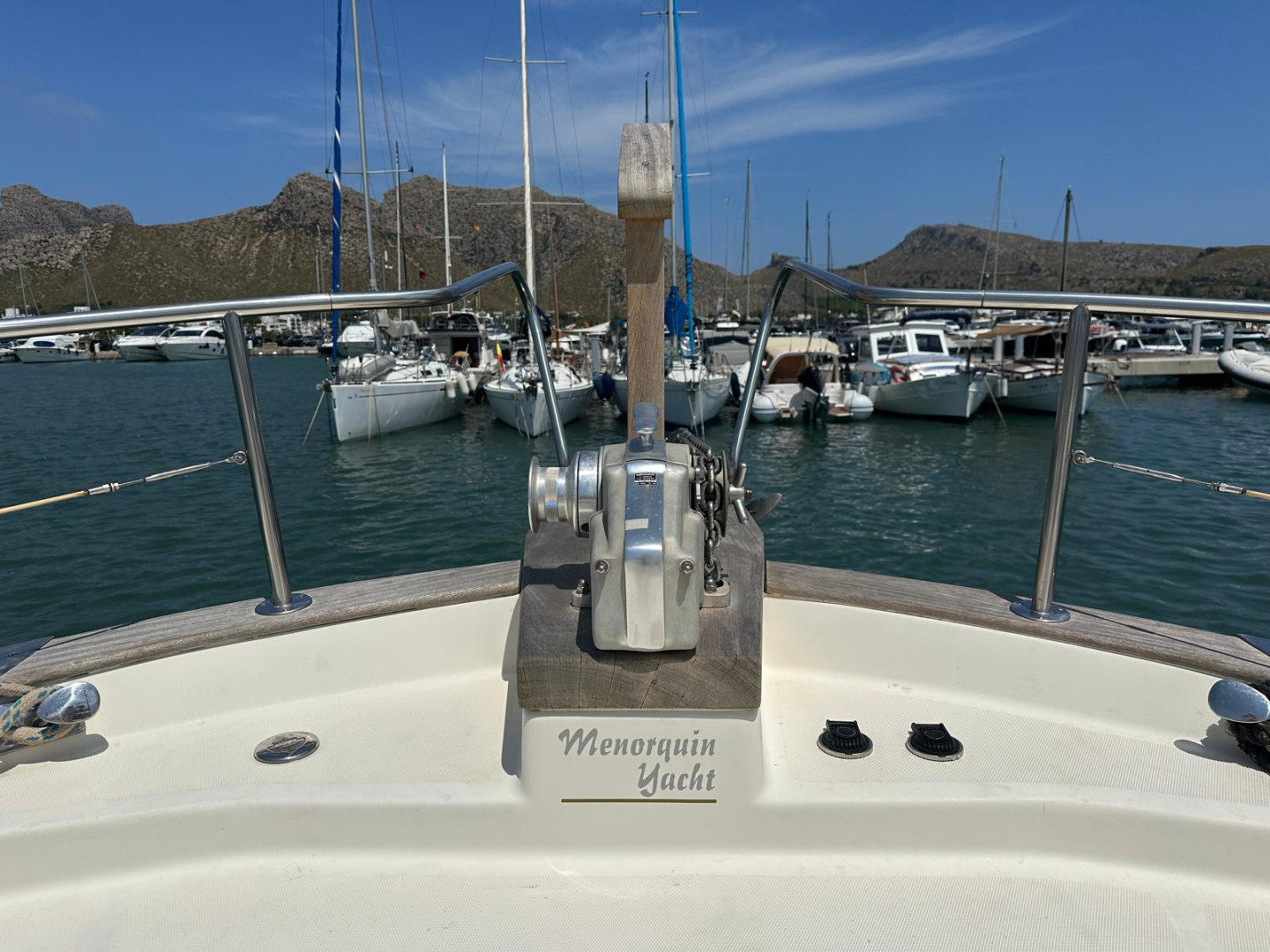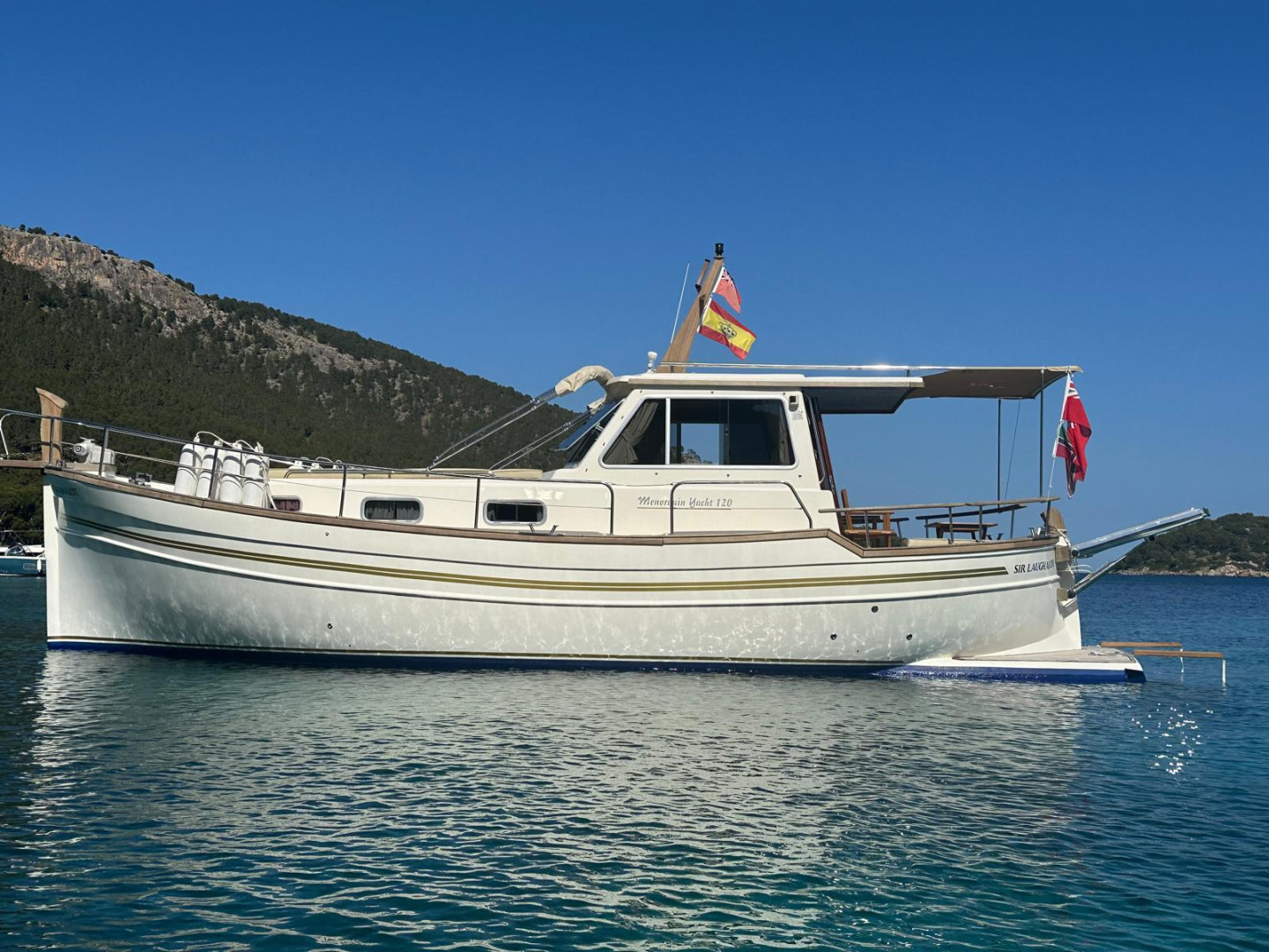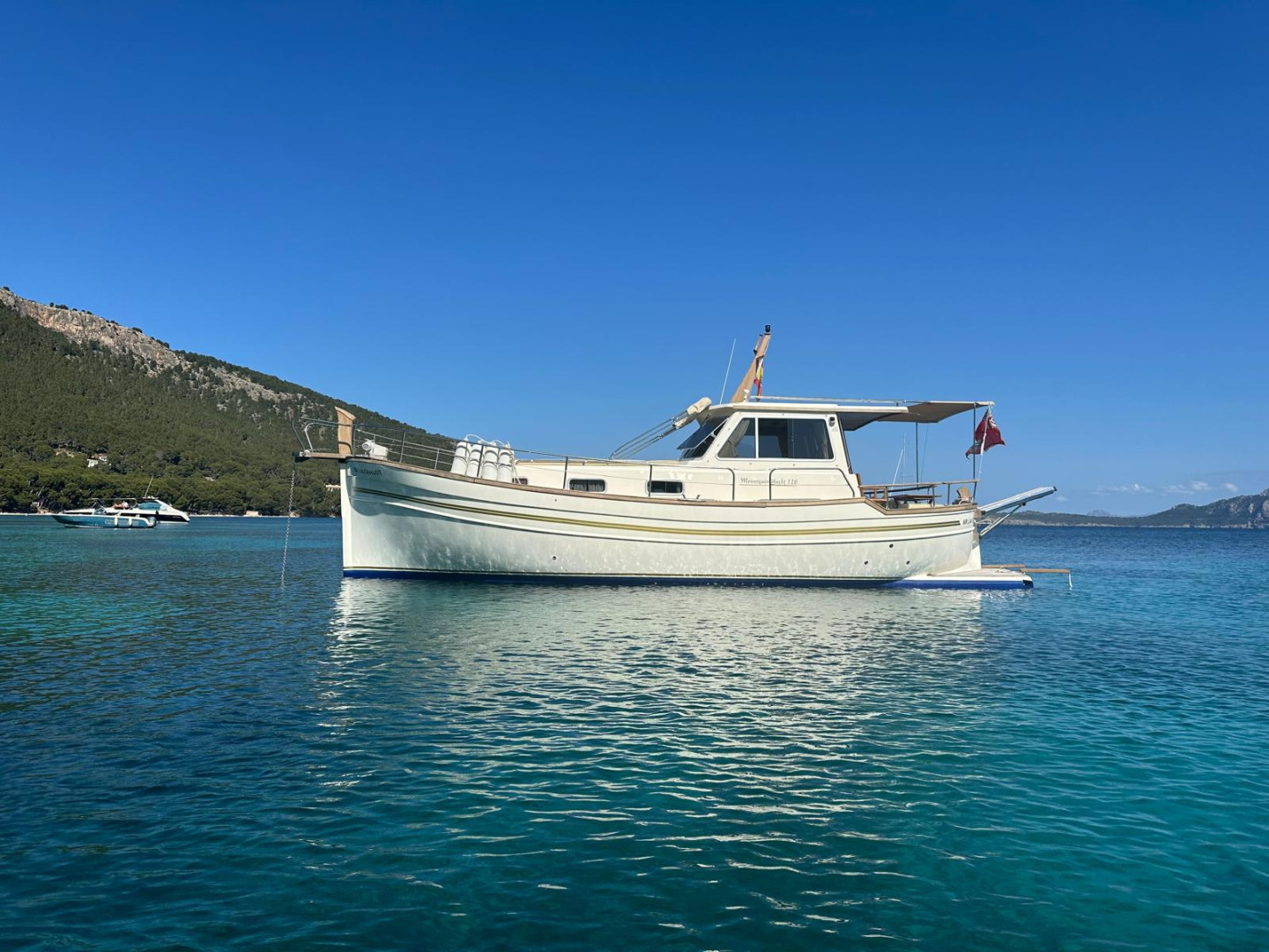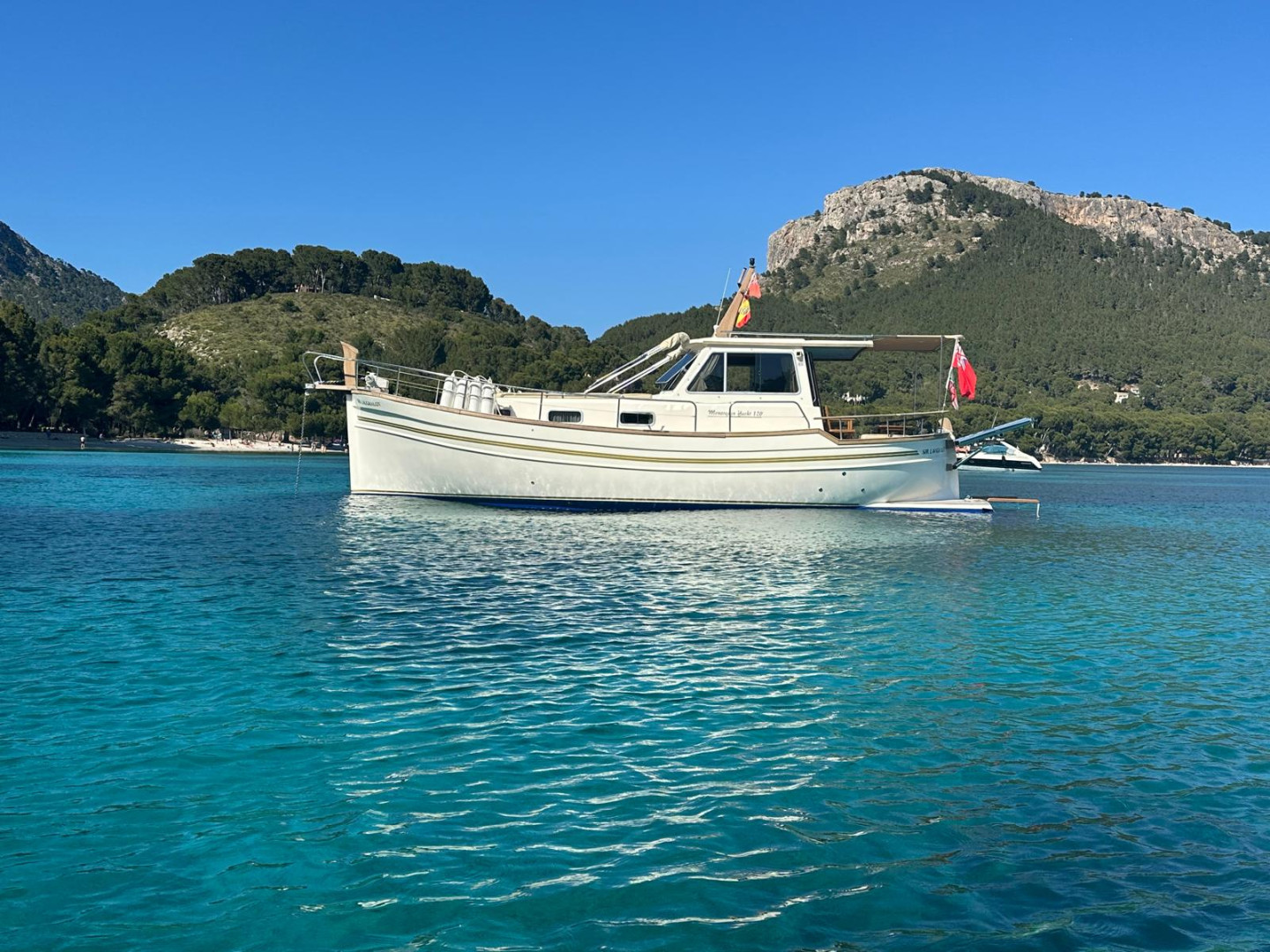 Menorquín 120 (2007), an elegant and solid motor yacht, ideal for enjoying the sea with maximum comfort and safety. She stands out for her classic Menorcan style, excellent finishes, and spacious layout both on deck and below.