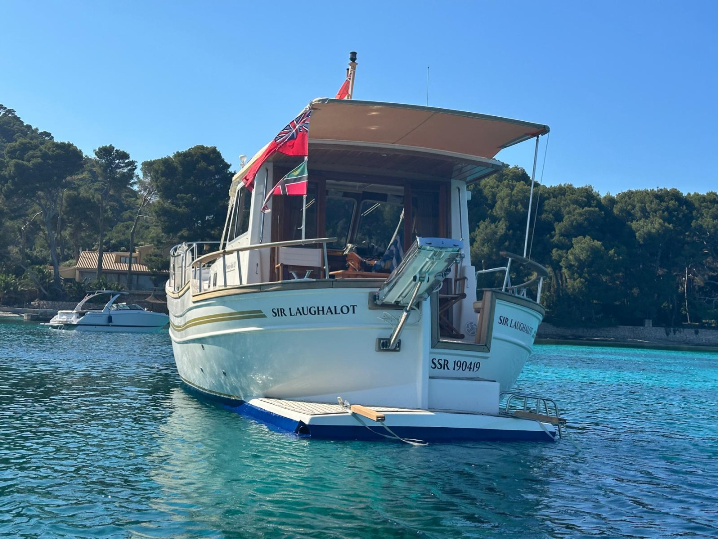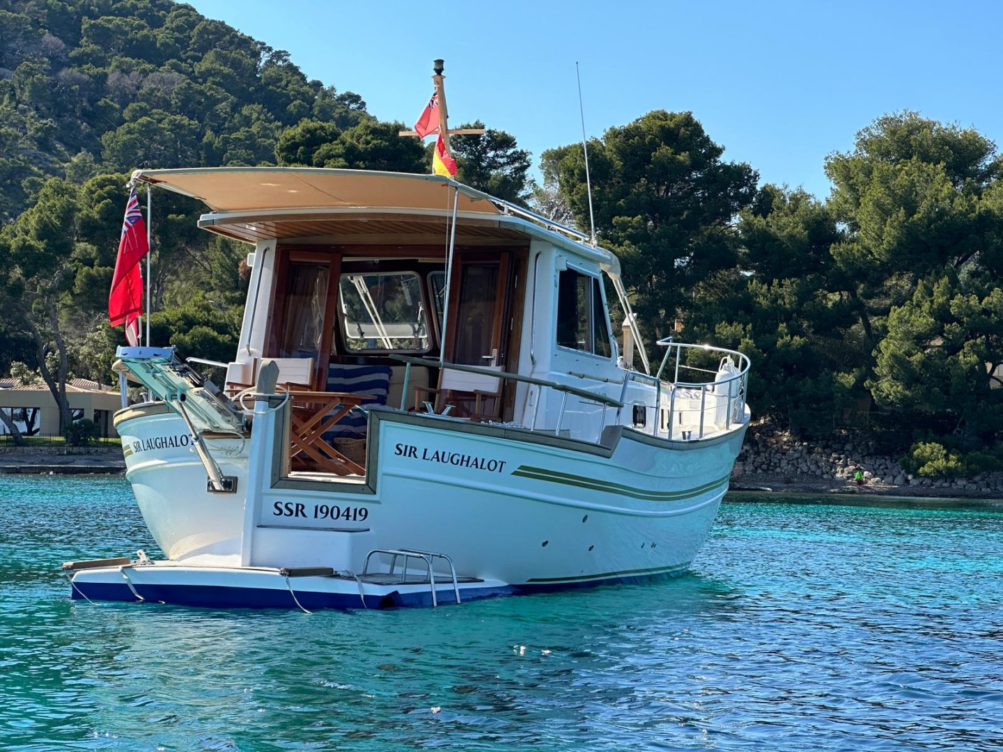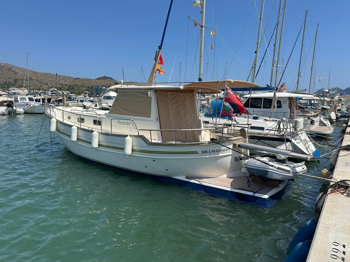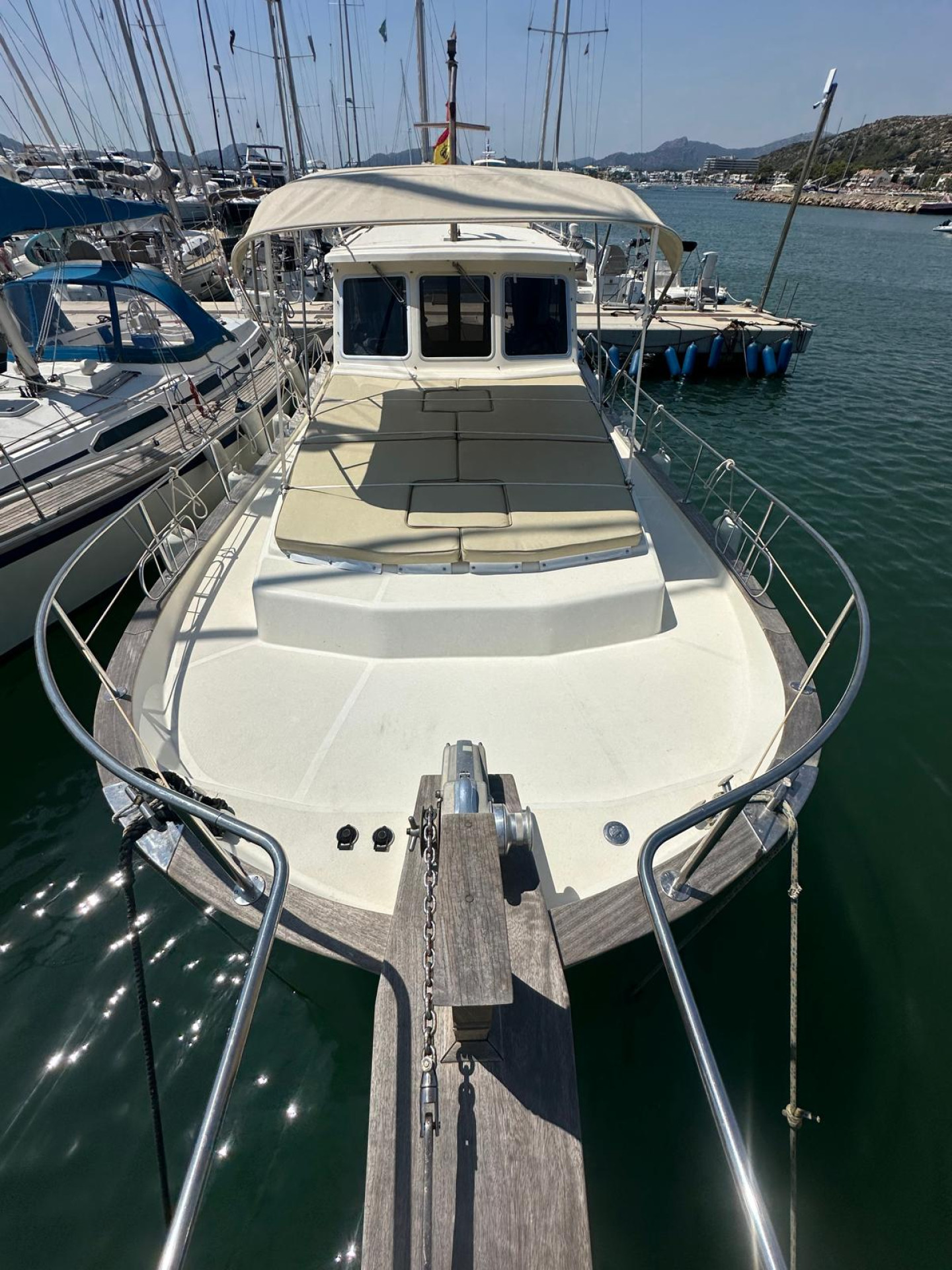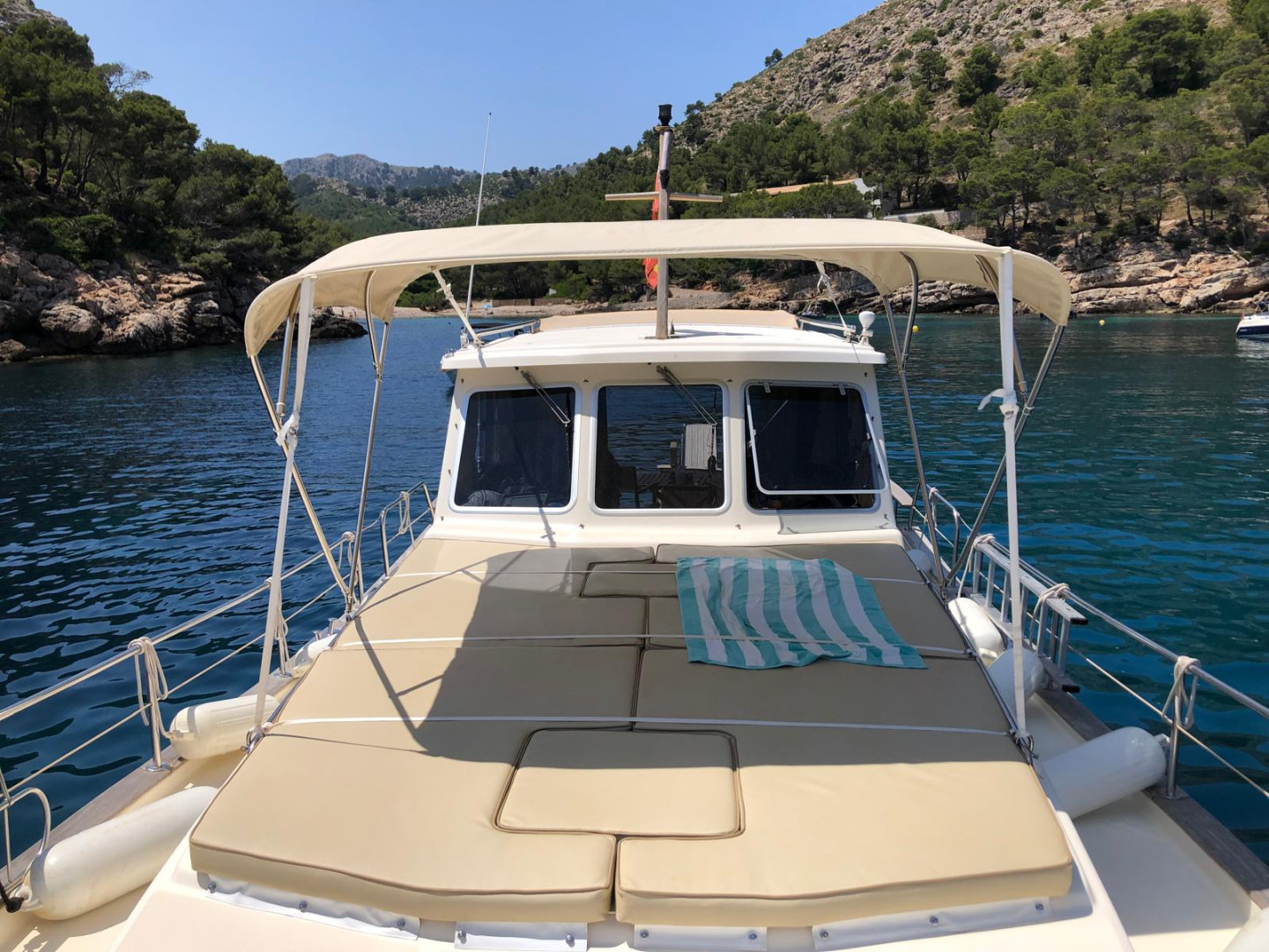 Menorquín 120 (2007), an elegant and solid motor yacht, ideal for enjoying the sea with maximum comfort and safety. She stands out for her classic Menorcan style, excellent finishes, and spacious layout both on deck and below.